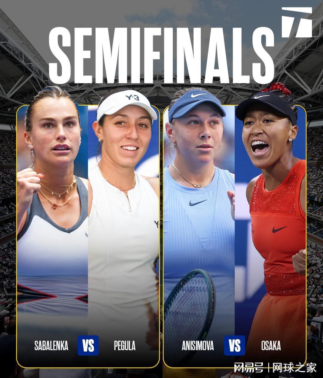 随着捷克姑娘穆霍娃被淘汰后,本届美网的女单四强阵容正式确定:萨巴伦卡、佩古拉、阿尼西莫娃和大坂直美。