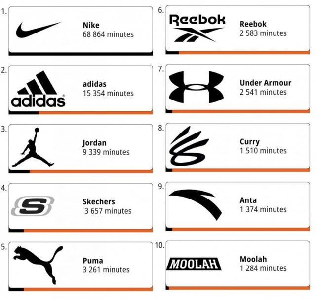 而在上脚时间的品牌排行中,Nike以68864分钟排名第一,前十中也有国产品牌出现。